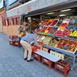 Un superbe étalage très coloré de fruits de saison qui donne envie aux chalands de passage, ainsi qu'aux habitués, de s'arrêter, d'entrer et de consommer.